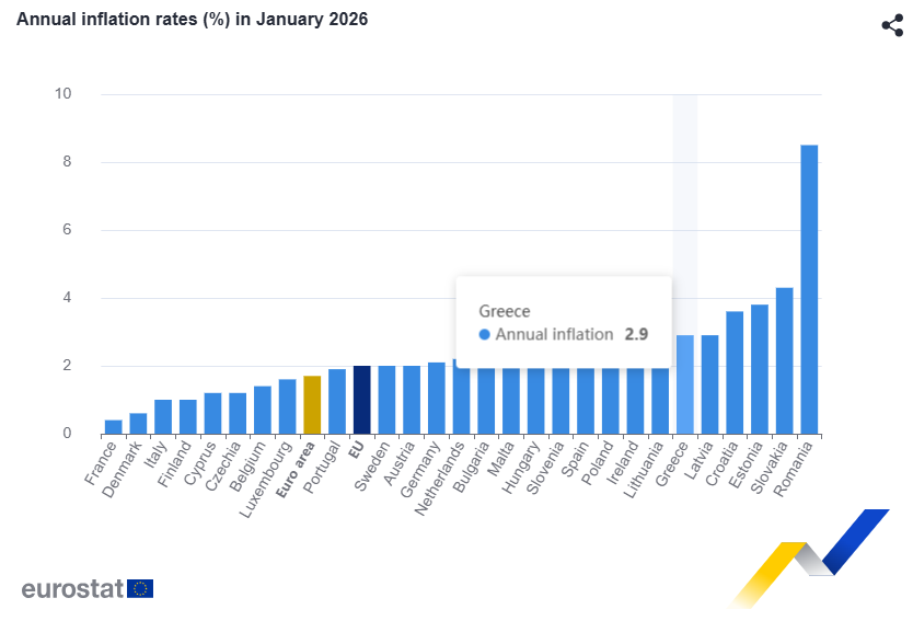 Τα χαμηλότερα ετήσια ποσοστά καταγράφηκαν στη Γαλλία (0,4%), στη Δανία (0,6%), καθώς και στη Φινλανδία και την Ιταλία (1% και στις δύο περιπτώσεις). Τα υψηλότερα ποσοστά σημειώθηκαν στη Ρουμανία (8,5%), στη Σλοβακία (4,3%) και στην Εσθονία (3,8%). Σε σύγκριση με τον Δεκέμβριο του 2025, ο ετήσιος πληθωρισμός μειώθηκε σε 23 κράτη-μέλη, παρέμεινε σταθερός σε ένα και αυξήθηκε σε τρία.