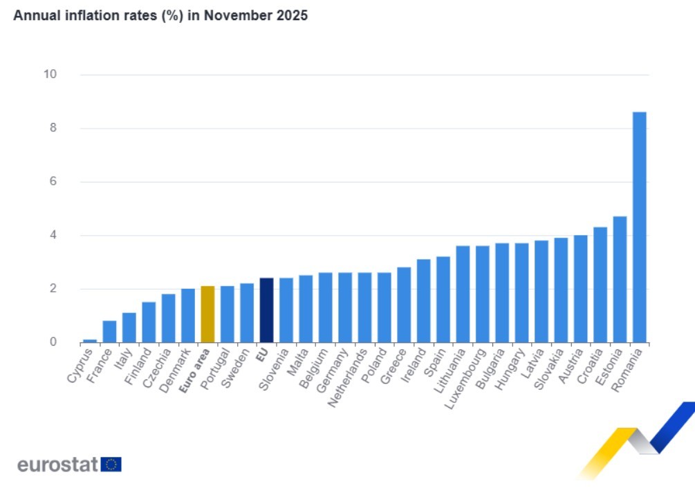 Ο ετήσιος πληθωρισμός στην ευρωζώνη διαμορφώθηκε στο 2,1% τον Νοέμβριο του 2025, σταθερός σε σχέση με τον Οκτώβριο. Ένα χρόνο νωρίτερα, ο πληθωρισμός ήταν 2,2%. Στην Ευρωπαϊκή Ένωση, ο ετήσιος πληθωρισμός ανήλθε στο 2,4% τον Νοέμβριο του 2025, μειωμένος από το 2,5% του Οκτωβρίου. Ένα χρόνο πριν, ο πληθωρισμός ήταν 2,5%.