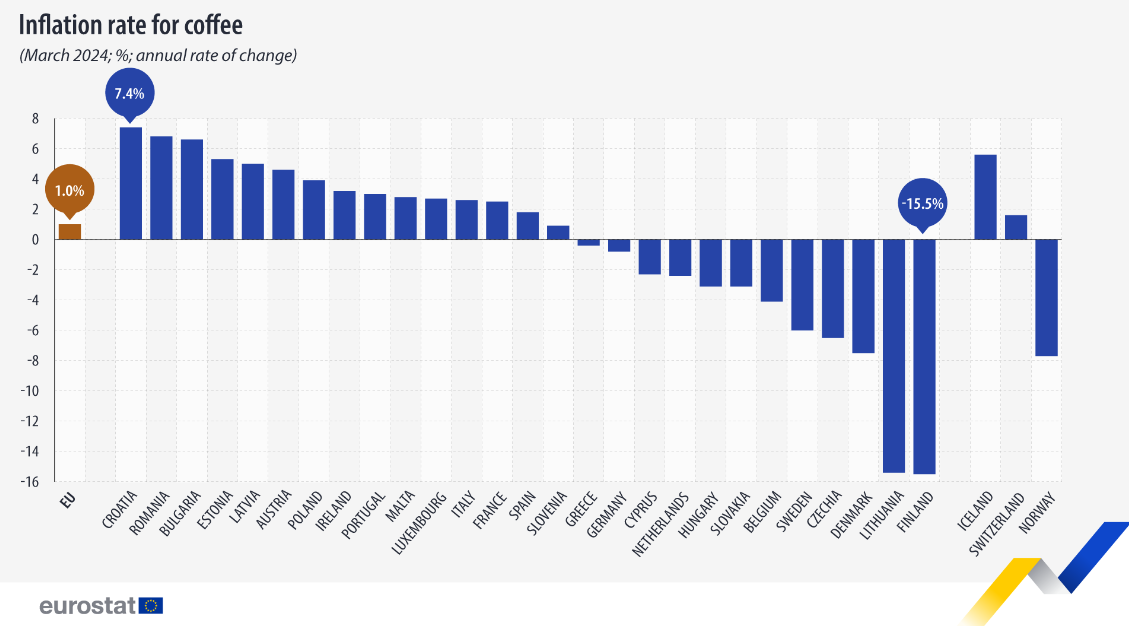 Σε 15 χώρες της ΕΕ, ο ρυθμός πληθωρισμού του καφέ ήταν υψηλότερος τον Μάρτιο του 2024 από τον Μάρτιο του 2023. Οι μεγαλύτερες αυξήσεις στις τιμές του καφέ καταγράφηκαν στην Κροατία (+7,4%), στη Ρουμανία (+6,8%) και τη Βουλγαρία (+6,6%).