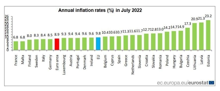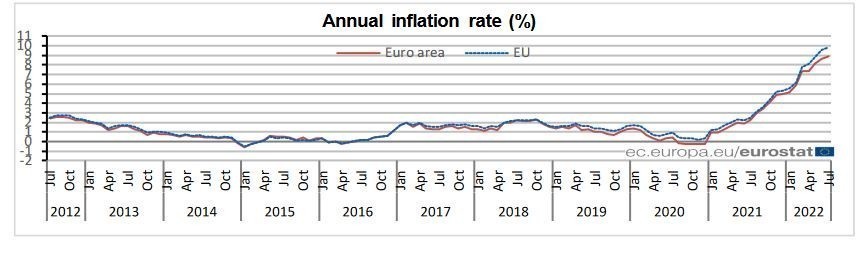 Στο 8,9% αυξήθηκε τον Ιούλιο ο ετήσιος πληθωρισμός της Ευρωζώνης, από 8,6% τον Ιούνιο και 2,2% ένα χρόνο νωρίτερα, σύμφωνα με τα στοιχεία που έδωσε σήμερα στη δημοσιότητα η Eurostat.