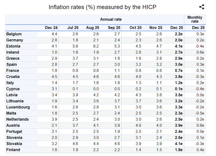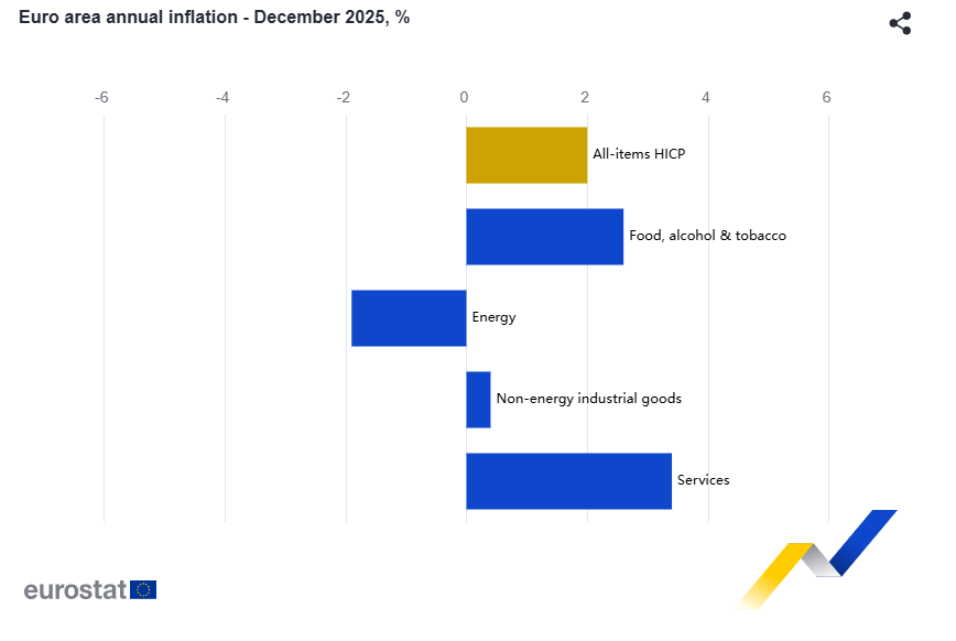 Στην Ευρωζώνη, σύμφωνα με τα προκαταρκτικά στοιχεία της Eurostat για τον περασμένο μήνα, ο δείκτης τιμών καταναλωτή εκτιμάται ότι διαμορφώθηκε στο 2%, παραμένοντας δηλαδή κοντά στον στόχο της ΕΚΤ. Πρόκειται για μικρή αποκλιμάκωση από το 2,1% του Δεκεμβρίου.