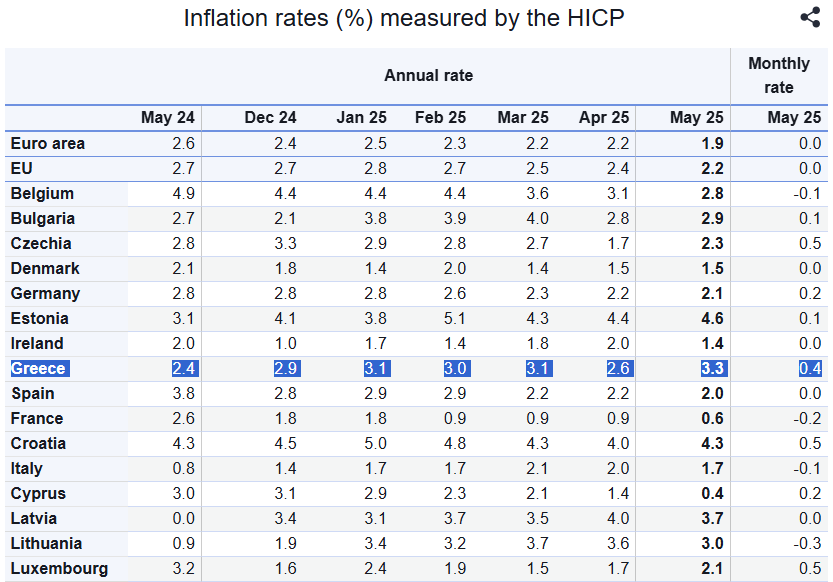 Ανέβασε ταχύτητα ο ετήσιος πληθωρισμός στην Ελλάδα τον Μάιο, σύμφωνα με τα στοιχεία της Eurostat, καθώς διαμορφώθηκε στο 3,3%, από 2,6% τον Απρίλιο και 2,4% τον Μάιο του 2024. Σε μηνιαία βάση, ο πληθωρισμός αυξήθηκε κατά 0,4%.