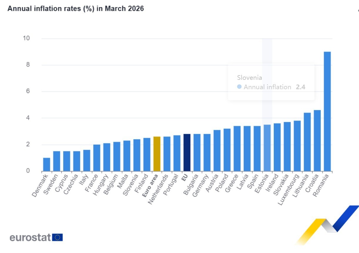 Τα χαμηλότερα ετήσια ποσοστά πληθωρισμού καταγράφηκαν στη Δανία (1,0%), καθώς και στην Τσεχία, την Κύπρο και τη Σουηδία (όλες στο 1,5%). Αντίθετα, τα υψηλότερα επίπεδα σημειώθηκαν στη Ρουμανία (9,0%), την Κροατία (4,6%) και τη Λιθουανία (4,4%). Σε σύγκριση με τον Φεβρουάριο του 2026, ο ετήσιος πληθωρισμός μειώθηκε σε τρία κράτη-μέλη, παρέμεινε αμετάβλητος σε ένα και αυξήθηκε σε είκοσι τρία.