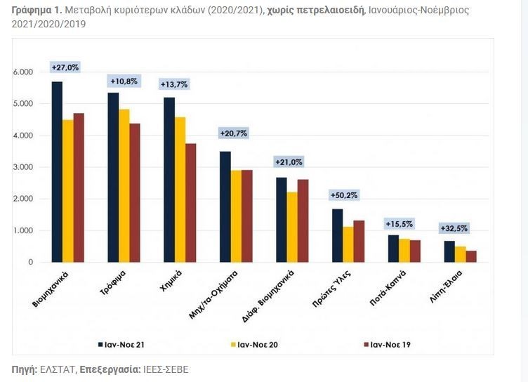 Η ανοδική πορεία των ελληνικών εξαγωγών συνολικά διαμορφώθηκε από τη θετική πορεία όλων των επιμέρους κλάδων, τόσο σε σχέση με το 2020, όσο και με το 2019. Αναλυτικά, ανοδική πορεία κατέγραψαν οι εξαγωγές βιομηχανικών (+27%), των τροφίμων (+10,8%), των χημικών (+13,7%), των μηχανημάτων και οχημάτων (+20,7%), των διάφορων βιομηχανικών (+21%), των πρώτων υλών (+50,2%), των ποτών και καπνών (+15,5%), των λιπών και ελαίων (+32,5%), και των μη ταξινομημένων προϊόντων (+17,7%).