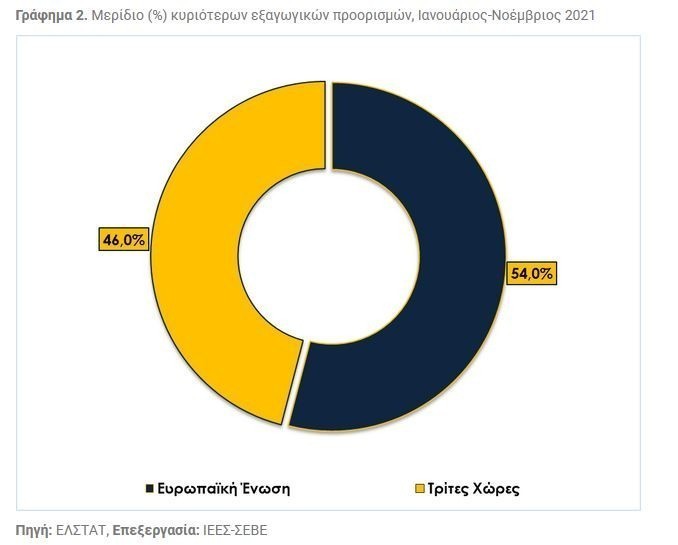 Σε ό,τι αφορά στους προορισμούς των ελληνικών εξαγωγών αγαθών, οι χώρες της ΕΕ (27) απορρόφησαν το μεγαλύτερο μέρος, ήτοι το 54%, ενώ οι τρίτες χώρες το 46,0%. Στο αντίστοιχο διάστημα του 2020, τα ποσοστά ήταν 57,7% για την ΕΕ και 42,3% για τις τρίτες χώρες.