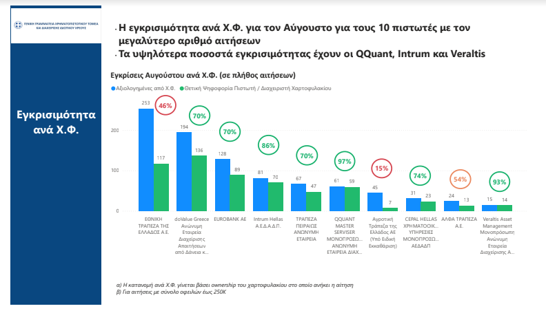 H Εθνική Τράπεζα έχει το μεγαλύτερο πλήθος αιτήσεων με εγκρισιμότητα 46% ενώ η Quant είναι αυτή που έχει το μεγαλύτερο πλήθος εγκρίσεων 97%. Από τους πιο κινητικούς πιστωτές είναι η Do Value και η Intrum.