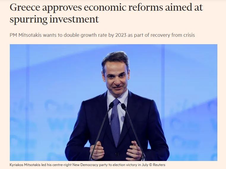 Όπως αναφέρει η εφημερίδα, «το κοινοβούλιο της Ελλάδας ενέκρινε ένα πακέτο οικονομικών μεταρρυθμίσεων που προωθήθηκε από τον πρωθυπουργό Κυριάκο Μητσοτάκη, σε μια προσπάθεια να προωθήσει τις επενδύσεις και να επιταχύνει την ανάπτυξη της ελληνικής οικονομίας, μετά τη νίκη του στις εκλογές, καθώς η Ελλάδα ανακάμπτει από μια οικονομική κρίση που διήρκεσε μια δεκαετία, κι η οποία μείωσε την εθνική παραγωγή κατά 25% και ανάγκασε 450.000 εργαζόμενους να αναζητήσουν θέσεις εργασίας το εξωτερικό».