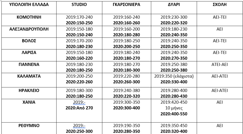 Στην Κέρκυρα το κόστος ενοικίασης φοιτητικής κατοικίας έχει εκτοξευτεί, το κόστος ενοικίασης studio αγγίζει τα 380€/μήνα, όταν το 2019 η ανώτατη τιμή ήταν 300€ δλδ +26%. Η ενοικίαση γκαρσονιέρας κοστίζει από 260€ έως 450€ και το δυάρι κυμαίνεται από 350€ έως 500€, όταν τη περσυνή χρονιά το αντίστοιχο κόστος ήταν από 250€ έως 300€ και από 300€ έως 450€.