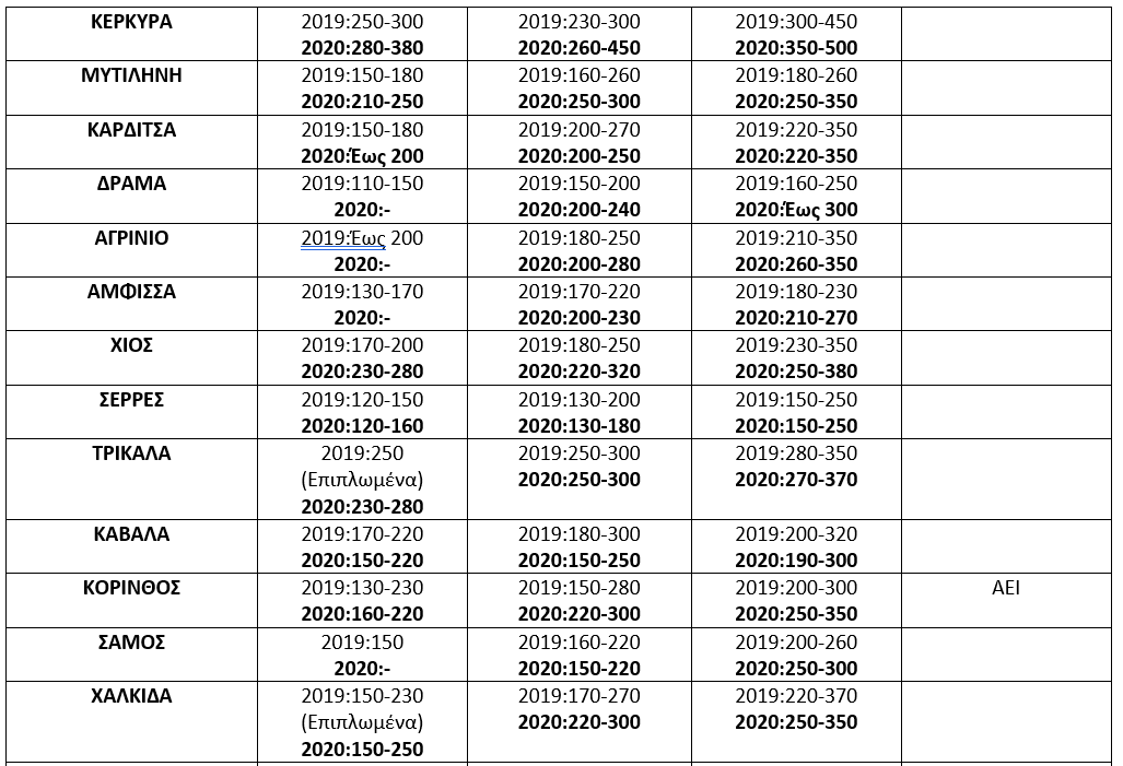 Σημαντικές αυξήσεις καταγράφονται και στη Μυτιλήνη, Χίο και Σάμο . Στη Μυτιλήνη οι ζητούμενες τιμές για ενοικίαση studio κυμαίνεται από 210€ έως 250€, για γκαρσονιέρα από 250€ έως 300€ και για δυάρι από 250€ έως 350€. Οι αντίστοιχες τιμές το 2019 για studio κυμαίνονταν από 150€ έως 180€, για γκαρσονιέρα από 160€ έως 260€ και για δυάρι από 180€ έως 260€.