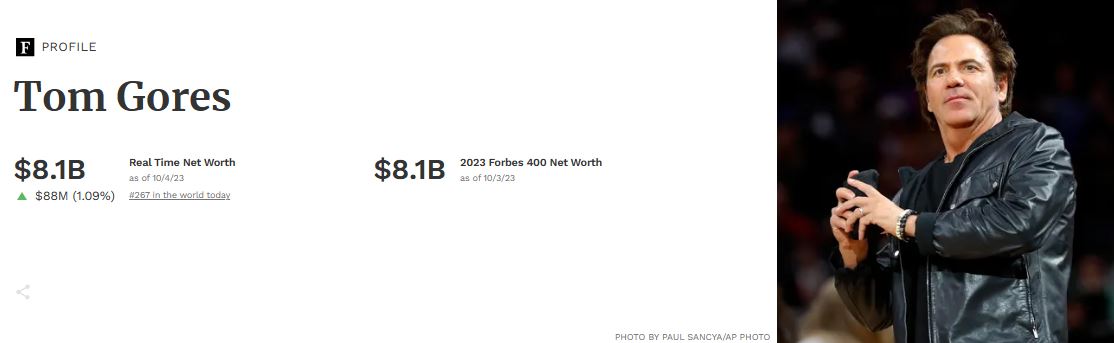 Από τα στοιχεία του Forbes προκύπτει ότι το πλουσιότερο άτομο ελληνικής καταγωγής στον πλανήτη για φέτος είναι ο Τομ Γκόρες, ένας επιχειρηματίας που μέσω της private equity εταιρείας του, Platinum Equity, έχει επενδύσει σε περισσότερες από 40 επιχειρήσεις, με συνολικό ενεργητικό 47 δισ. δολαρίων. Γεννημένος το 1964 στη Ναζαρέτ από Έλληνα πατέρα και Λιβανέζα μητέρα, ήταν το πέμπτο από τα έξι παιδιά της οικογένειας. Όταν ήταν μόλις τεσσάρων χρόνων, η οικογένεια μετανάστευσε στο Μίσιγκαν. Σήμερα, ο 59χρονος Τομ Γκόρες έχει περιουσία 8,1 δισ. δολαρίων και βρίσκεται στην 108η θέση της λίστας Forbes 400.