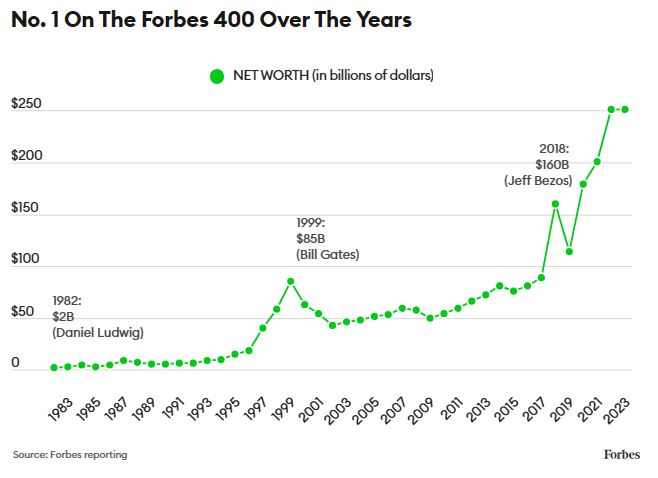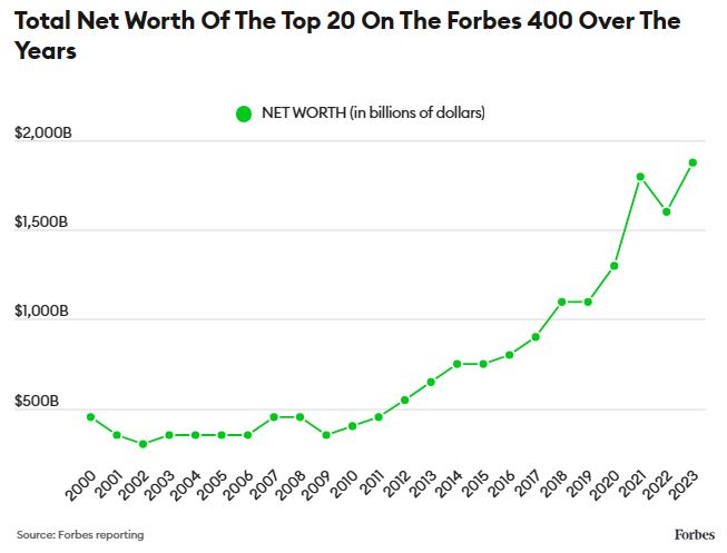 Οι 400 πλουσιότεροι κροίσοι της Αμερικής που μπήκαν στη λίστα Forbes 400 το 2023 αύξησαν τη συνολική περιουσία τους κατά 500 δισ. δολάρια σε σχέση με πέρυσι. Συνολικά, ελέγχουν πλούτο 4,5 τρισ. δολαρίων.