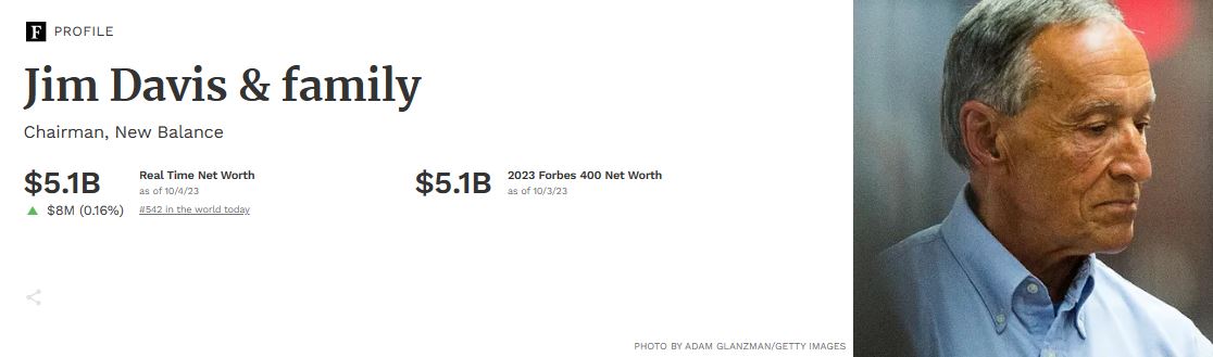 Ακολουθεί ο 80χρονος Τζιμ Ντέιβις, που διαθέτει περιουσία 5,1 δισ. δολαρίων και βρίσκεται στην 215η θέση της λίστας. Ο επιχειρηματίας, που έχει γεννηθεί στις ΗΠΑ από Έλληνες γονείς, αγόρασε το 1972 μία μικρή εταιρεία παπουτσιών στη Βοστώνη και τη μετέτρεψε σε έναν γίγαντα του κλάδου. Η New Balance πραγματοποιεί ετήσιο τζίρο 4,4 δισ. δολαρίων.