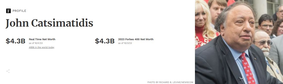 Ο 75χρονος Τζον Κατσιματίδης ή αλλιώς και «βασιλιάς των σούπερ μάρκετ» της Νέας Υόρκης, διαθέτει περιουσία 4,3 δισ. δολαρίων και βρίσκεται στην 267η θέση της λίστας. Γιος ενός φαροφύλακα από τη Νίσυρο, παράτησε το πανεπιστήμιο για να γίνει συνέταιρος στο σούπερ μάρκετ όπου δούλευε και από εκεί, έχτισε μια επιχειρηματική αυτοκρατορία.
