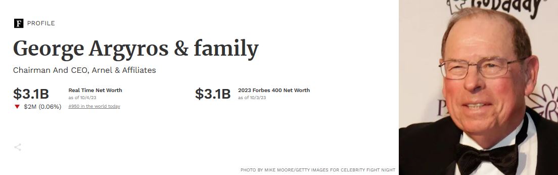Στην 366η θέση της λίστας βρίσκεται ο Τζορτζ Αργυρός, με περιουσία 3,1 δισ. δολαρίων. Ο 86χρονος σήμερα επιχειρηματίας είναι εγγονός Ελλήνων μεταναστών που για να σπουδάσει δούλευε μοιράζοντας εφημερίδες και ταμίας σε σούπερ μάρκετ. Η περιουσία του προέρχεται από το real estate και άλλες επενδύσεις.