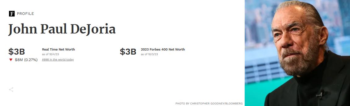 Στην 379η θέση της λίστας, με περιουσία 3 δισ. δολαρίων, βρίσκεται ο ελληνοϊταλικής καταγωγής Τζον Πολ Ντετζόρια, ιδρυτής της εταιρείας τεκίλα Patron Spirits Co. αλλά και της εταιρείας προϊόντων περιποίησης μαλλιών John Paul Mitchell Systems. O 79χρονος σήμερα δισεκατομμυριούχος έχει παραδεχθεί πως υπήρξε άστεγος δύο φορές στη ζωή του.