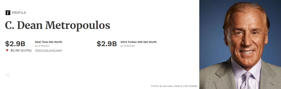 Στην 395η θέση, με περιουσία 2,9 δισ. δολαρίων, βρίσκεται ο 77χρονος Σ. Ντιν Μητρόπουλος. Γιος ενός αγρότη από την Τρίπολη, ήταν μόλις 10 χρόνων όταν η οικογένειά του μετανάστευσε στις ΗΠΑ και εγκαταστάθηκε στη Μασαχουσέτη, αναζητώντας μια καλύτερη ζωή. Στις ΗΠΑ είναι γνωστός γιατί εξαγοράζει ξεπεσμένα brands κυρίως από τον κλάδο των τροφίμων, όπως για παράδειγμα τα φημισμένα Twinkies, και τα αναβιώνει.
