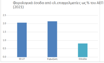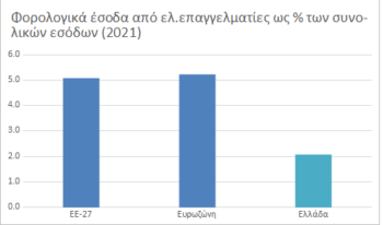 -Και πάλι λόγω του προβλήματος της φοροδιαφυγής, σύμφωνα με την ετήσια έκθεση της Ευρωπαϊκής Επιτροπής για τη φορολογία (https://taxation-customs.ec.europa.eu/taxation-1/economic-analysis-taxation/data-taxation-trends_en) τα έσοδα από τη φορολογία των ελεύθερων επαγγελματιών το 2021 αντιστοιχούσαν στο 0,8% του ΑΕΠ έναντι 2,1 % που είναι ο μέσος όρος στην ΕΕ.