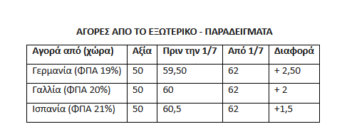 Πρακτικά, αν κάποιος αγοράζει από καταστήματα εξωτερικού, θα χρεώνεται πλέον με ΦΠΑ 24% αντί πχ 19% που χρεωνόταν όταν αγόραζε από Γερμανία ή 20% από Γαλλία. Αυτό σημαίνει περίπου 4% ακριβότερη χρεώση για αγορές από Ευρώπη, αναλόγως φυσικά και του είδους που τιμολογείται (πχ βιβλία με 6% ΦΠΑ κλπ).
