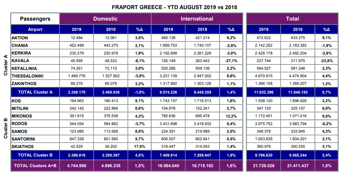 Υπενθυμίζεται εδώ ότι με βάση τα στοιχεία του Ινστιτούτου του Συνδέσμου Ελληνικών Τουριστικών Επιχειρήσεων Insete, οι προγραμματισμένες αεροπορικές θέσεις για το σύνολο της τουριστικής σεζόν του 2019 στα κυριότερα περιφερειακά αεροδρόμια της χώρας (σ.σ. όχι μόνο τα 14 που διαχειρίζεται η Fraport) από το Μάρτιο έως και τον Οκτώβριο εμφανίζονται μειωμένες κατά 6,7%, σε σχέση με το 2018 ή αλλιώς κατά 1,2 εκατ. λιγότερες σε σύγκριση με πέρυσι. Ειδικά για τον Αύγουστο, οι θέσεις ήταν μειωμένες κατά 258 χιλ. ή αλλιώς κατά 8,4% έναντι του Αυγούστου του 2018.