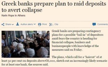 Το ελληνικό bail-in, όπως σημειώνεται, θα μπορούσε να βασίζεται στο σενάριο της Κύπρου, όπου έγινε κούρεμα στις καταθέσεις των πελατών των χρηματοπιστωτικών ιδρυμάτων, άνω των 100.000 ευρώ.