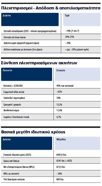 Ωστόσο, η εικόνα διαφοροποιείται αισθητά το 2025. Παρότι διατηρήθηκε υψηλός αριθμός προγραμματισμένων πλειστηριασμών, η πραγματική ολοκλήρωσή τους ήταν περιορισμένη. Ενδεικτικά, μόλις περίπου 1 στα 7 ακίνητα των προγραμματισμένων πλειστηριασμών κατέληξε σε επιτυχή πώληση, γεγονός που μεταφράζεται σε ποσοστό κοντά στο 14%. Το ποσοστό αυτό διαμορφώνεται σε 20%-25% σε ό,τι αφορά τους πλειστηριασμούς που τελικώς διενεργήθηκαν. Το συνολικό ιδιωτικό χρέος από δάνεια ανερχόταν στο τρίτο τρίμηνο του 2025 στα 245 δισ. ευρώ (περίπου ένα ολόκληρο ΑΕΠ), με τα επιχειρηματικά δάνεια να αποτελούν το μεγαλύτερο ποσοστό.