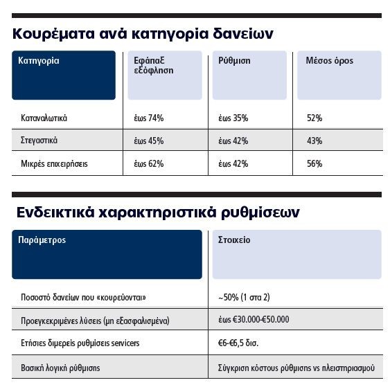 Ενα στα δύο δάνεια, αναφέρουν πηγές με γνώση του θέματος, κουρεύεται. Σε όλα τα δάνεια η μεταχείριση είναι διαφορετική στις περιπτώσεις που κάποιος δίνει όλο το ποσό και σε εκείνες που ρυθμίζει το συνολικό ποσό. Για τα καταναλωτικά στις πρώτες περιπτώσεις το κούρεμα διαμορφώνεται μέχρι και 74% και στις δεύτερες μέχρι και 35% με μέσο όρο 52%. Στα στεγαστικά, 45% και 42% με μέσο όρο 43% και στα small business (επιχειρηματικά δάνεια μικρών επιχειρήσεων), 62% και 42% με μέσο όρο 56%.