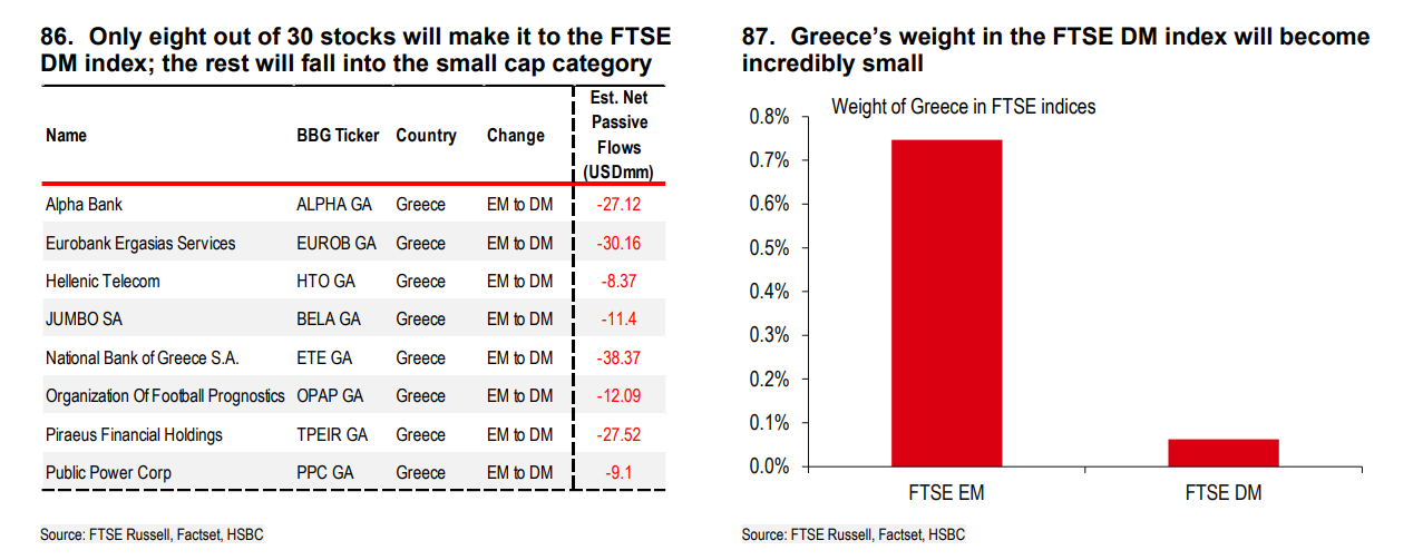 Ο καθοριστικός παράγοντας, ωστόσο, βρίσκεται στους δείκτες. Η HSBC αντιμετωπίζει την επικείμενη μετάβαση της Ελλάδας σε καθεστώς ανεπτυγμένης αγοράς όχι ως αναβάθμιση, αλλά ως δυνητικό αρνητικό καταλύτη. Η απόφαση του FTSE Russell να εντάξει την Ελλάδα στις ανεπτυγμένες αγορές, με εφαρμογή από το φθινόπωρο του 2026, εκτιμάται ότι μπορεί να οδηγήσει σε παθητικές εκροές που προσεγγίζουν τα 400 εκατ. δολάρια. Το πρόβλημα δεν είναι μόνο το μέγεθος των εκροών, αλλά η δομή τους: από τις 30 ελληνικές μετοχές που συμμετέχουν σήμερα στον δείκτη FTSE Emerging Markets, μόλις οκτώ αναμένεται να διατηρήσουν θέση στον δείκτη αναπτυγμένων αγορών, ενώ οι υπόλοιπες θα υποβαθμιστούν στον δείκτη μικρής κεφαλαιοποίησης, με σαφώς χαμηλότερη επενδυτική προβολή.
