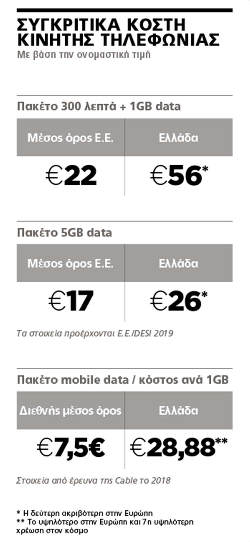 Σχετικά με τις τιμές που πληρώνουν οι Ελληνες για δεδομένα σε κινητή μέσω φορητών συσκευών (laptop, tablet κ.λπ.) το report DESI της Ε.Ε. σημειώνει: «Οι τιμές στην κινητή για φωνή με δεδομένα παρουσιάζουν μεγάλες διακυμάνσεις ανά την Ευρώπη. Στο πακέτο που αφορά 300 δωρεάν κλήσεις και 1 GB σε data οι ελάχιστες τιμές κυμαίνονται μεταξύ 8 ευρώ και 59 ευρώ, με μέσο όρο στην Ε.Ε. στα 22 ευρώ, ήτοι 2 ευρώ πιο φθηνά σε σχέση με έναν χρόνο πριν». Η χώρα μας όμως είναι η δεύτερη ακριβότερη με 56 ευρώ, με «πρωταθλήτρια» πανευρωπαϊκά τη Βουλγαρία με 59 ευρώ. «Οι πιο φθηνές χώρες», σημειώνει η έκθεση της Επιτροπής, «είναι το Λουξεμβούργο, η Ιταλία, η Σλοβενία, η Αυστρία και η Γαλλία με τιμές κάτω των 10 ευρώ».
