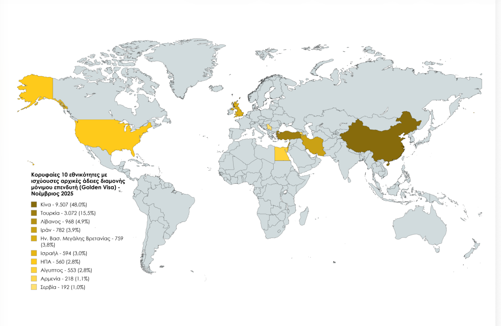 Με βάση τα στοιχεία από το υπουργείο Μετανάστευσης και Ασύλου, ως προς τις κορυφαίες εθνικότητες με ισχύουσες αρχικές άδειες διαμονής μόνιμου επενδυτή Golden Visa, οι 9.507 ή αλλιώς το 48% αφορούν τους Κινέζους, ακολουθούν με 3.072 ή 15,5% οι Τούρκοι κι εν συνεχεία με μονοψήφια ποσοστά οι Λιβανέζοι (4,9%), Ιρανοί (3,9%) και Βρετανοί (3,8%). «Για την Τουρκία ο επίμονος πληθωρισμός και η υποτίμηση της τουρκικής λίρας έχουν μετατρέψει το ακίνητο σε βασικό μέσο προστασίας περιουσίας. Πολλοί Τούρκοι επενδυτές επιλέγουν την Ελλάδα όχι μόνο για τη Χρυσή Βίζα, αλλά και ως ασφαλή εναλλακτική έναντι της εγχώριας αγοράς», όπως αναφέρεται από το μεσιτικό Greca House.