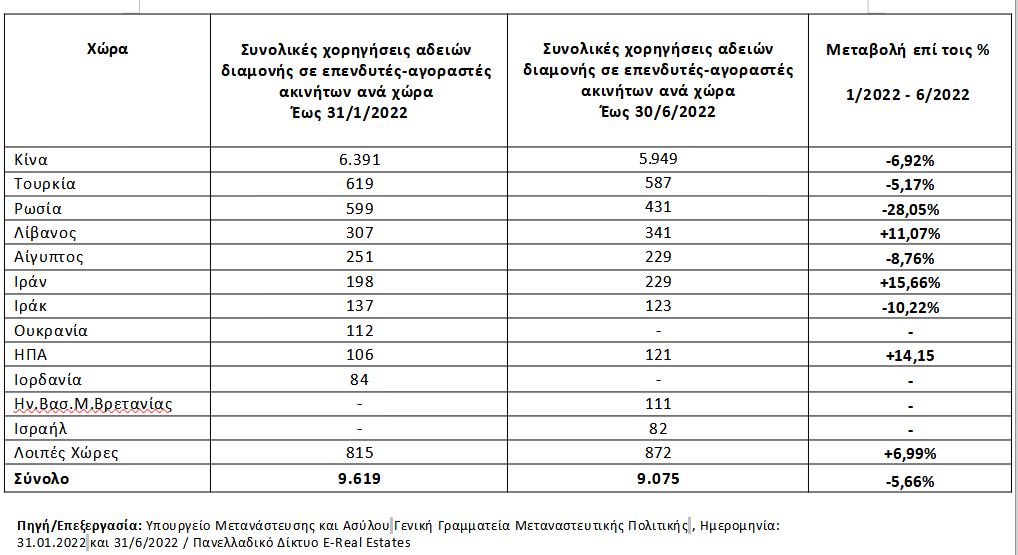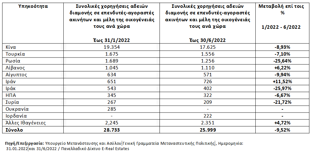 To πρώτο εξάμηνο του 2022, αποτελεί την πρώτη χρονιά που το ισοζύγιο αφίξεων – αποχωρήσεων είναι αρνητικό. Σύμφωνα με τα στοιχεία που προκύπτουν από το Υπουργείο Μετανάστευσης και Ασύλου – Γενική Γραμματεία Μεταναστευτικής Πολιτικής, το σύνολο των εκδοθέντων αδειών πενταετούς παραμονής σε επενδυτές ακινήτων ύψους τουλάχιστον 250.000 ευρώ, αλλά και σε επενδυτές πλέον σε άυλους τίτλους (μετοχές, ομόλογα, καταθέσεις) καταγράφει απώλειες της τάξεως του 5,66%. Δηλαδή, από το σύνολο των 9.614 αδειών που είχαν χορηγηθεί από την έναρξη του προγράμματος έως και 31/12/2021 και ήταν ενεργές, έξι μήνες μετά, το σύνολο των ενεργών αδειών είναι μειωμένες κατά 539, αριθμώντας πλέον τις 9.074.