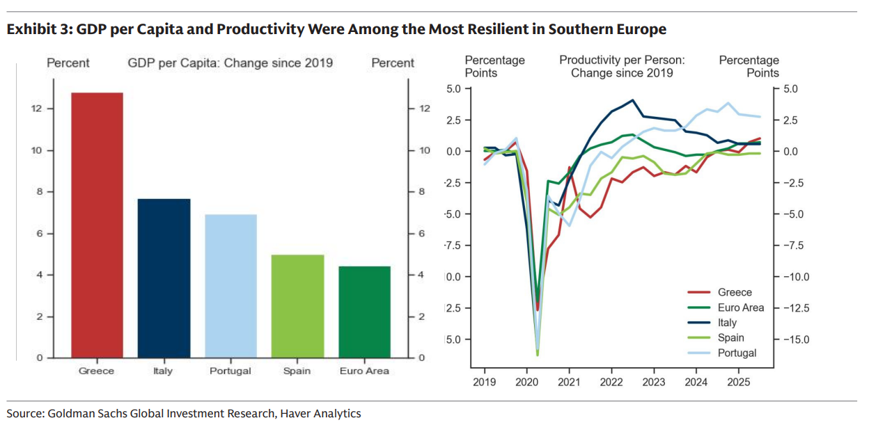 Σε μια Ευρωζώνη που παλεύει με χαμηλούς ρυθμούς μεγέθυνσης, η Goldman Sachs βλέπει ότι η Ελλάδα παραμένει μια από τις λίγες οικονομίες που συνεχίζουν να διαμορφώνουν θετικό αφήγημα. Η τράπεζα θεωρεί ότι το 2025 η χώρα θα εξακολουθήσει να αναπτύσσεται με ρυθμό υψηλότερο του ευρωπαϊκού μέσου όρου, παρά το γεγονός ότι τρεις παράγοντες –η δημοσιονομική σύσφιξη, η πίεση από τα ακραία καιρικά φαινόμενα και η ηπιότερη ώθηση από τον τουρισμό– θα μπορούσαν, υπό άλλες συνθήκες, να λειτουργήσουν ως «φρένο».