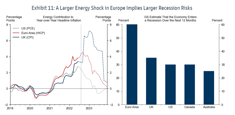 Η βασική πρόβλεψη για την Ευρωζώνη είναι ότι θα μπει σε ήπια ύφεση, με ετήσιο ρυθμό ανάπτυξης -0,3% και -0,6% το τρίτο και το τέταρτο τρίμηνο, αντίστοιχα, ωστόσο υπάρχουν ακόμη σημαντικά περιθώρια για αναθέρμανση στη Νότια Ευρώπη. Η σημασία της ενέργειας στον πληθωρισμό είναι πολύ μεγαλύτερη και πιο οπισθοβαρής στη ζώνη του ευρώ και στο Ηνωμένο Βασίλειο από ό,τι στις ΗΠΑ. Αυτό συνεπάγεται χειρότερες προοπτικές για το πραγματικό εισόδημα, τις καταναλωτικές δαπάνες και τη βιομηχανική δραστηριότητα στην Ευρώπη, εξηγεί η αμερικανική επενδυτική τράπεζα. Μεγαλύτερες διαταραχές στον εφοδιασμό με φυσικό αέριο, μεγαλύτερες αυξήσεις των τιμών της ενέργειας ή δευτερογενείς επιδράσεις μέσω των αλυσίδων εφοδιασμού και των διαύλων εμπιστοσύνης θα μπορούσαν να καταστήσουν την ύφεση στη ζώνη του ευρώ βαθύτερη από ότι στο βασικό σενάριο.