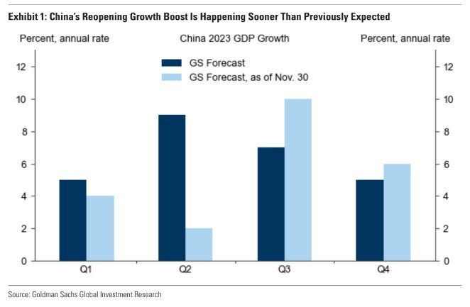 Η Goldman Sachs εκτιμά ότι η ανάπτυξη στην Κίνα αναμένεται να επιταχυνθεί, καθώς η χώρα ανοίγει ξανά νωρίτερα από ό,τι αναμενόταν και η ταχεία επαναλειτουργία της θα δημιουργήσει πιθανότατα θετικές δευτερογενείς επιπτώσεις στην παγκόσμια ανάπτυξη το 2023 αλλά και μια μέτρια ώθηση στον παγκόσμιο πληθωρισμό.