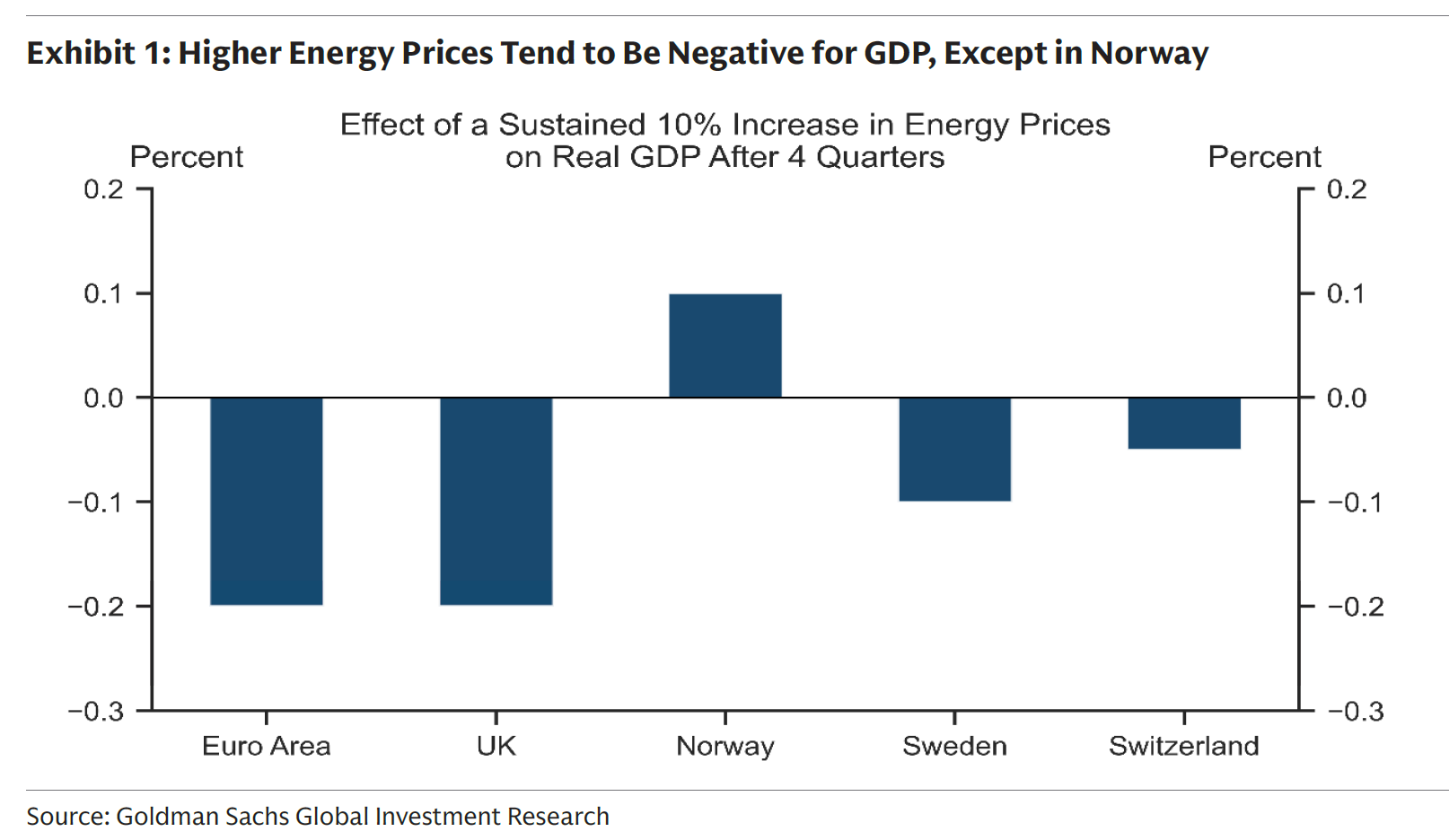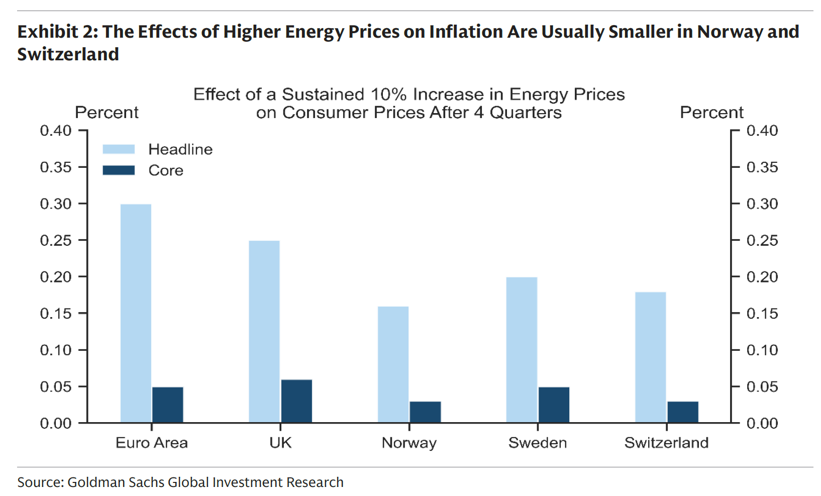 Η Goldman Sachs ποσοτικοποιεί το σοκ και υπολογίζει ότι μια αύξηση 10% στον μέσο όρο τιμών πετρελαίου και φυσικού αερίου εκτιμάται ότι μειώνει το πραγματικό ΑΕΠ σε ορίζοντα τεσσάρων τριμήνων κατά 0,2% στη ζώνη του ευρώ και στο Ηνωμένο Βασίλειο. Στη Σουηδία η επίπτωση περιορίζεται σε -0,1%, στην Ελβετία είναι σχεδόν μηδενική, ενώ στη Νορβηγία καταγράφεται θετική επίδραση +0,1%, λόγω του ρόλου της ως παραγωγού και εξαγωγέα πετρελαίου.