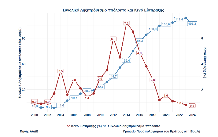 Αντί να εισπραχθούν όμως, τα 30 δισ. ληξιπρόθεσμα χρέη έγιναν 44,7 δισ. το 2012, έφτασαν 63,4 δισ. το 2014, στα 86 δισ. το 2016 και «πάτησαν» τα 100 δισ. το 2018! Το 2023 ξεπέρασαν τα 111 δισ. ευρώ ενώ μόνο το 2024 μειώθηκαν στα 106,3 δισ.