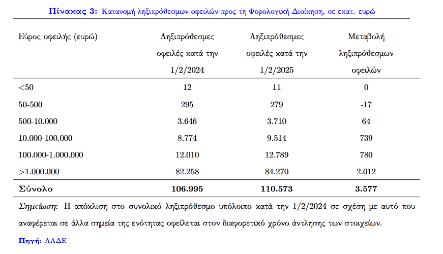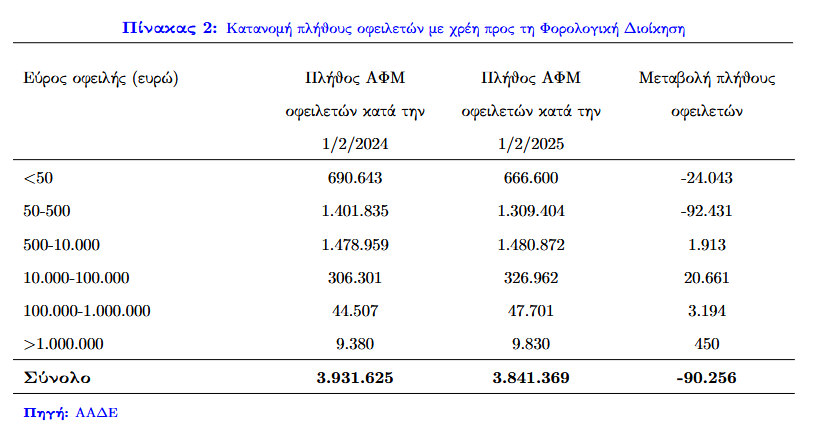 Αναφορικά με τον συνολικό αριθμό των οφειλετών, στο τέλος Ιανουαρίου του 2025 παρατηρείται μείωση κατά 90.256 πρόσωπα (φυσικά και νομικά) σε σχέση με την αντίστοιχη περίοδο του 2024 με αποτέλεσμα να διαμορφώνεται στους 3.841.369 οφειλέτες.