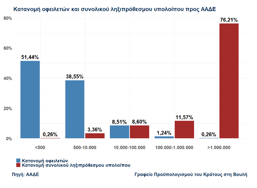 • μόλις 0,3% των οφειλετών έχει χρέη άνω του 1 εκατ. ευρώ, αλλά αυτοί χρωστούν το 76,2% του συνολικού ληξιπρόθεσμου υπολοίπου.