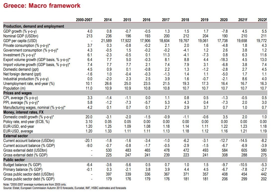 Η HSBC βλέπει ότι οι ξένοι τουρίστες φτάνουν φέτος μόλις στο 40% των προ κρίσης επιπέδων. Έτσι, παρόλο που αναθεώρησε προς τα πάνω τη φετινή ανάπτυξη (από 2,2% σε 4,5%), εξακολουθεί να αναμένει υψηλότερη ανάπτυξη το 2022 (σε 5,5%, από 6,0%).