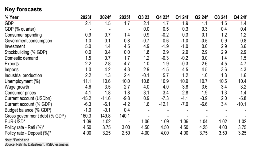 Η βρετανική τράπεζα HSBC μειώνει την πρόβλεψή της για την ανάπτυξη το 2023 από 2,2% σε 2,1%, και βλέπει αύξηση του ΑΕΠ κατά 1,5% το 2024 από 1,3% και κατά 1,7% το 2025 (από 1,5%), λόγω των πρόσθετων κονδυλίων του RePowerEU και της χαλάρωσης της νομισματικής πολιτικής από την ΕΚΤ, η οποία αναμένεται να στηρίξει τις επενδύσεις.