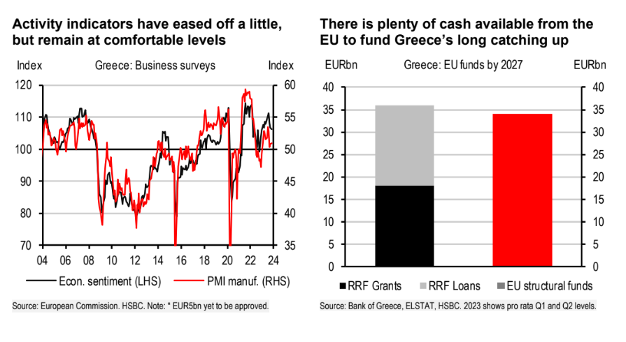 «Το 2023 θα είναι πιθανότατα μια χρονιά ρεκόρ για τον ελληνικό τουρισμό. Μέχρι το Σεπτέμβριο, ο αφίξεις και οι εισπράξεις είχαν φτάσει στο 103% και 110% των αντίστοιχων μεγεθών του 2019. Ενώ αυτό σημαίνει ότι η ανάπτυξη μετά την πανδημία μπορεί να έχει τελειώσει, εξακολουθούμε να βλέπουμε κάποια περιθώρια ανάπτυξης, καθώς η τουριστική περίοδος γίνεται όλο και μεγαλύτερη, επεκτεινόμενη στο πρώτο τρίμηνο και στο τέταρτο τρίμηνο. Συνολικά, η Ελλάδα έχει σημειώσει ισχυρή ανάκαμψη μετά την πανδημία. Αλλά το ΑΕΠ εξακολουθεί να είναι σχεδόν 15% χαμηλότερα από το επίπεδο του 2010, πριν από την κρίση δημόσιου χρέους. Έτσι, υπάρχουν ακόμη κάποιες αναπτυξιακές ευκαιρίες και βρίσκεται πλέον σε πιο βιώσιμες βάσεις. Η χρηματοδότηση είναι επίσης διαθέσιμη για την ανάπτυξη. Η χρήση του Ταμείου Ανάκαμψης και Ανθεκτικότητας της ΕΕ – από το οποίο η Ελλάδα έχει αντλήσει 35 δισ. ευρώ (18% του ΑΕΠ) – επιταχύνεται, ενώ η Ελλάδα θα λάβει επίσης περίπου 35 δισ. ευρώ από τα διαρθρωτικά ταμεία από τον προϋπολογισμό της ΕΕ κατά την περίοδο 2020-2027», εκτιμά η τράπεζα.