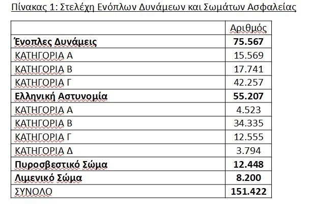 Ο συνολικός αριθμός των Στελεχών των Ενόπλων Δυνάμεων και των Σωμάτων Ασφαλείας είναι 151.422 και κατανέμεται ως εξής: