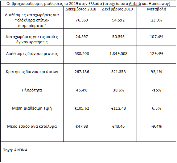 Ως προς τα στοιχεία της AirDNA για τις πληρότητες και τα έσοδα των ιδιοκτητών, λόγω ακριβώς της αυξημένης προσφοράς καταγράφεται πτώση για την περυσινή χρονιά. Η πτώση στην πληρότητα είναι σε ποσοστό 15%, από το 45,4% που ήταν η μέση πληρότητα του 2018 σε όλη την Ελλάδα, στο 38,6% για το 2019, ενώ το έσοδο ανά διαθέσιμο κατάλυμα μειώθηκε κατά 9,4% στα 43,5 ευρώ από 48 ευρώ το 2018.