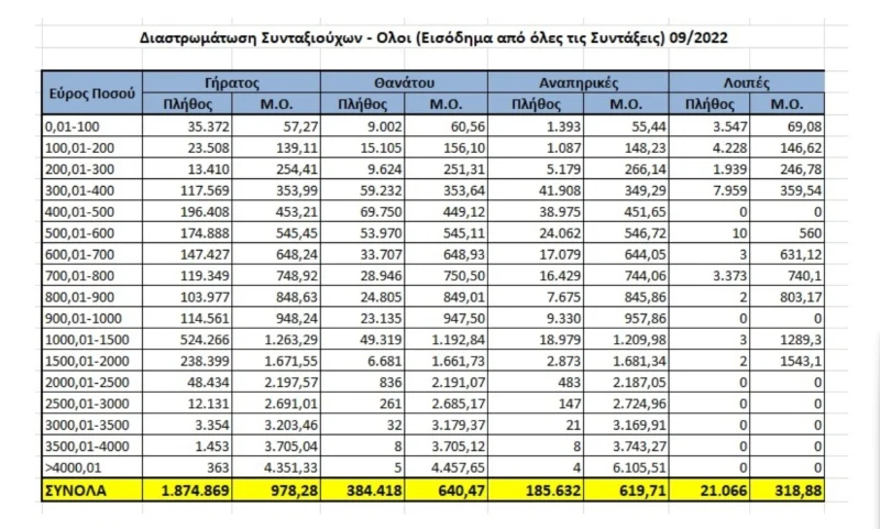 – 655.195 συνταξιούχοι λαμβάνουν σύνταξη ΕΩΣ 500 € (26,56%)