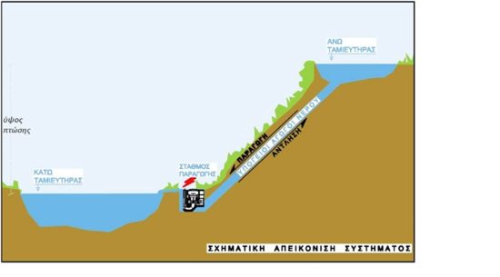 Οι δύο αυτές δεξαμενές νερού, λοιπόν, επικοινωνούν μεταξύ τους διαμέσου ενός σωλήνα με μια αντλία. Οταν υπάρχει αφθονία ηλεκτρικής ενέργειας στο σύστημα, π.χ. τα βράδια όπου η ζήτηση για ηλεκτρικό ρεύμα είναι χαμηλή αλλά φυσάει αέρας και οι ανεμογεννήτριες γυρίζουν χωρίς πελάτες για να αγοράσουν το ρεύμα που παράγουν, η αντλία χρησιμοποιεί το ρεύμα που περισσεύει και θα πήγαινε χαμένο για να στείλει το νερό από τον κάτω στον πάνω ταμιευτήρα.