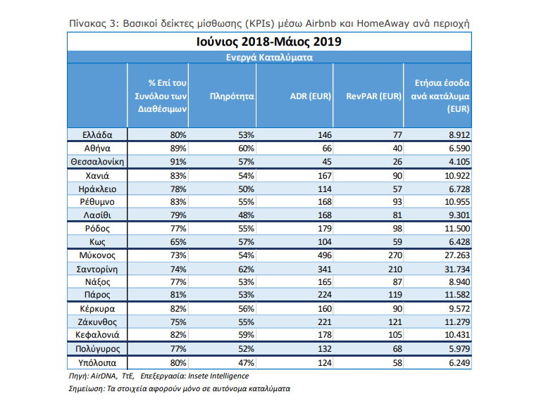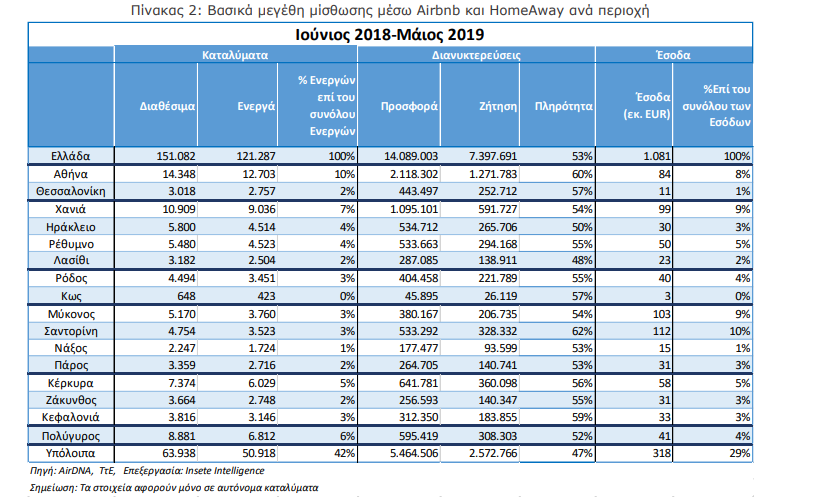Aπό το σύνολο του 1,08 δισ. ευρώ που υπολογίζεται ότι ήταν τα έσοδα για τα λεγόμενα αυτόνομα καταλύματα (αυτά δηλαδή που προσφέρονται ολόκληρα για μίσθωση, χωρίς να υπάρχουν κοινόχρηστοι χώροι) από τις γνωστές πλατφόρμες Airbnb και Homeaway για την περίοδο Ιουνίου 2018- Μαΐου 2019 τη μερίδα του λέοντος καρπώνεται η Σαντορίνη, στην οποία αντιστοιχεί το 10% επί του συνόλου ή αλλιώς 112 εκατ. ευρώ.