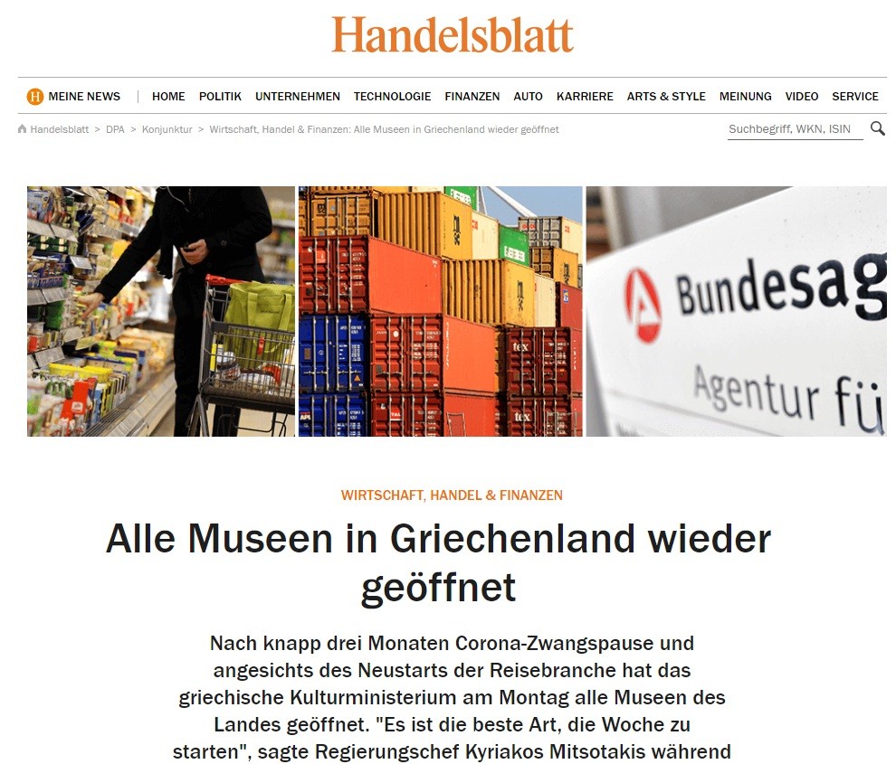 Σε άλλο άρθρο της η γερμανική οικονομική εφημερίδα Handelsblatt υποστηρίζει ότι πλέον στην Ελλάδα είναι όλα τα μουσεία ανοιχτά.