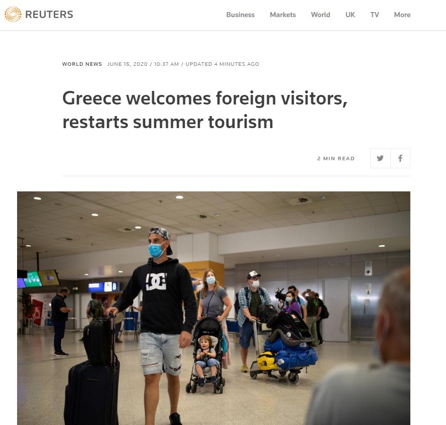 «H Ελλάδα καλωσορίζει τους ξένους επισκέπτες, ξαναρχίζει ο τουρισμός του καλοκαιριού», είναι ο τίτλος του πρακτορείου Reuters.