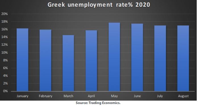 Η ανεργία σημείωσε μια αύξηση 1,2% από τον Μάρτιο στον Απρίλιο, 1,3% από τον Απρίλιο στον Μάιο, ενώ σημείωσε μια μικρή μείωση κατά τη διάρκεια της καλοκαιρινής τουριστικής περιόδου. Ο ΟΟΣΑ έχει προβλέψει ότι η ανεργία θα φτάσει σχεδόν στο 20% μέχρι το τέλος του χρόνου.