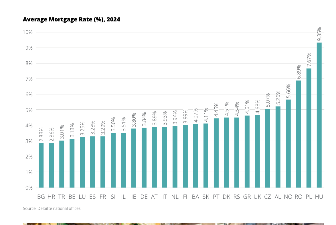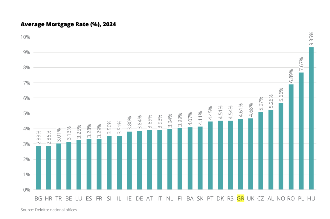 Η Deloitte αναλύει και την εικόνα στην αγορά στεγαστικής πίστης, δεδομένου ότι «τα επιτόκια παίζουν καθοριστικό ρόλο στη διαμόρφωση του κόστους δανεισμού και της συνολικής προσιτότητας της στέγασης. Λόγω των μακροοικονομικών συνθηκών και των πολιτικών των κεντρικών τραπεζών, τα επιτόκια στεγαστικών δανείων εξακολουθούν να ποικίλλουν σημαντικά μεταξύ των χωρών». Μεταξύ των 28 χωρών που αναλύθηκαν από την εταιρεία φέτος (με στοιχεία 2024) η Ουγγαρία κατέγραψε το υψηλότερο μέσο επιτόκιο στεγαστικών δανείων, φτάνοντας το 9,35%. «Εάν υπολογιστεί ένας απλός μέσος όρος όλων των επιτοκίων που αναφέρθηκαν σε όλες τις συμμετέχουσες χώρες της έρευνας, ο συνολικός μέσος όρος θα ανερχόταν σε 4,36%, παραπέμποντας σε ένα μέτριο κόστος δανεισμού στην περιοχή», αναφέρεται στην έρευνα. Λίγο υψηλότερα βρίσκεται η Ελλάδα, με ένα 4,61%, ποσοστό πάντως που την κατατάσσει στην 8η θέση.