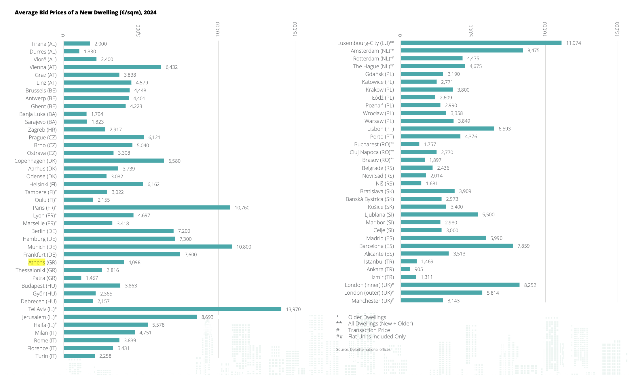 Το Λουξεμβούργο είναι η πιο ακριβή χώρα για την αγορά νέου σπιτιού φέτος, με μέση τιμή 8.760 ευρώ ανά τετραγωνικό μέτρο και ακολουθούν Ισραήλ και Ηνωμένο Βασίλειο με τιμές αντίστοιχα στα 6.131 ευρώ ανά τ.μ. και 5.203 ευρώ. Η Ελλάδα, με δεδομένη και τη μεγάλη ψαλίδα μεταξύ της Αθήνας και της Περιφέρειας (ειδικά στην ηπειρωτική χώρα), κατατάσσεται σε επίπεδο χώρας στις πιο φθηνές ευρωπαϊκές αγορές- κι αυτό παρά το διψήφιο ποσοστό αύξησης των τιμών πώλησης μέσα σε ένα χρόνο κατά 10,2%- με μία μέση τιμή στα 1.792 ευρώ ανά τ.μ. Σε επίπεδο πόλεων η Αθήνα είναι σαφώς υψηλότερα -όχι πάντως και πολύ ψηλά- σε σύγκριση με τις υπόλοιπες αγορές ανά την Ευρώπη με ένα μέσο όρο στις τιμές πώλησης για τις νέες κατοικίες, όπως αναφέρεται στην έρευνα της Deloitte, στα 4.098 ευρώ ανά τ.μ.. Σε επίπεδο πόλεων, το Τελ Αβίβ στο Ισραήλ παραμένει στην κορυφή της λίστας, όπου η τιμή ενός νέου διαμερίσματος φτάνει κατά μέσο όρο τα 13.970 ευρώ ανά τ.μ., ενώ στη Γηραιά Ηπειρο, η πόλη του Λουξεμβούργου είναι πολύ ακριβή με μία μέση τιμή στα νέα σπίτια στα 11.074 ευρώ ανά τ.μ., με τη Φραγκφούρτη και το Παρίσι να ακολουθούν με τιμές στα 10.800 ευρώ ανά τ.μ. και 10.760 ευρώ ανά τ.μ.